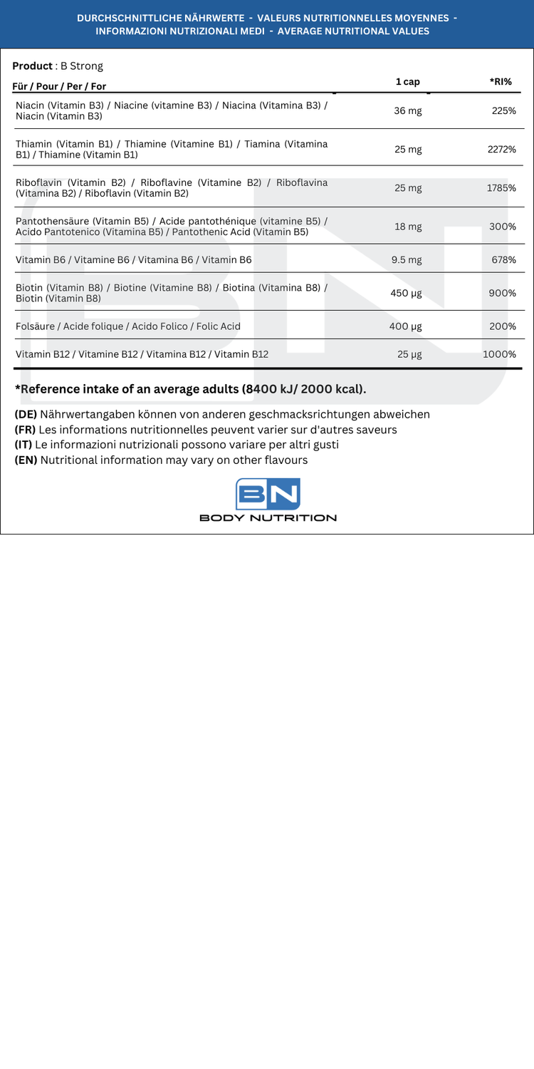 B Strong +Watt è disponibile in confezione da 60 capsule, gestita da magazzino in Svizzera e distribuita da Body Nutrition, punto di riferimento per integrazione e benessere quotidiano.