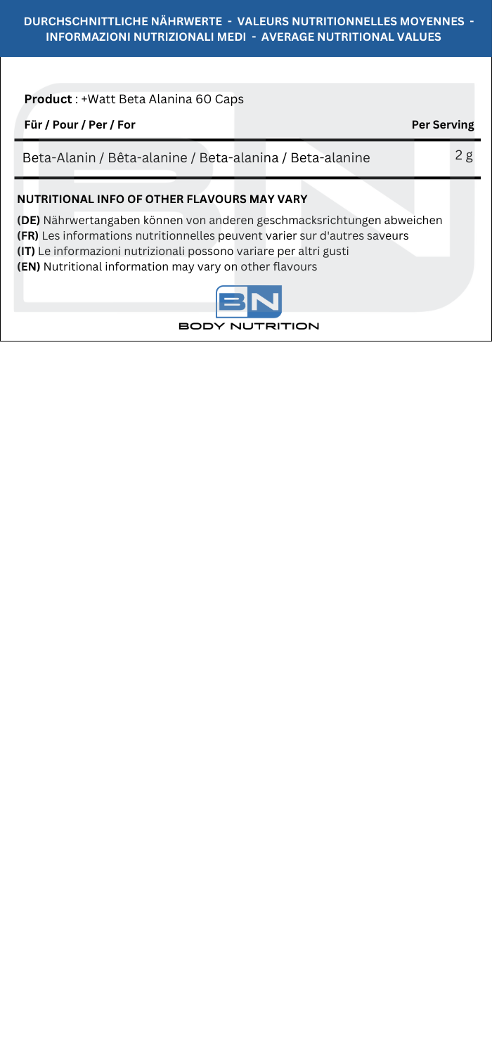 +WATT Beta-Alanine+ è formulato in capsule vegetali facili da deglutire, adatte anche a diete vegetariane e vegane. Il prodotto è senza glutine e realizzato secondo i più elevati standard di qualità e sicurezza.