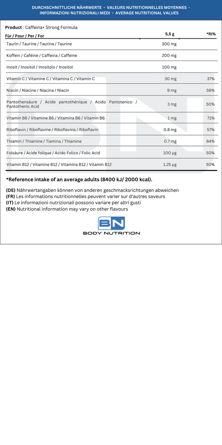 Avvertenze: Non superare la dose giornaliera consigliata. Non utilizzare in gravidanza o nei bambini. Gli integratori non vanno intesi come sostituti di una dieta varia ed equilibrata e di uno stile di vita sano. Si raccomanda di non superare un’assunzione complessiva di 400 mg di caffeina al giorno da tutte le fonti. Tenere fuori dalla portata dei bambini al di sotto dei 3 anni.