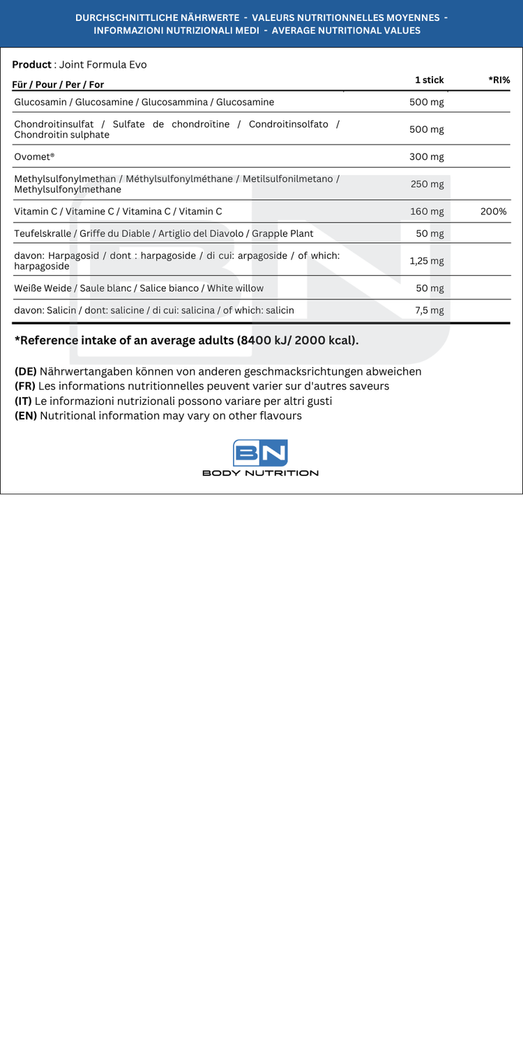 Joint Formula Evo Collagene è un integratore alimentare in bustine monodose solubili, formulato con una selezione di componenti specifici per il normale metabolismo del tessuto connettivo. Contiene N-acetil-D-glucosamina (da crostacei), condroitinsolfato, Ovomet® (membrana da guscio d’uovo), MSM (metilsulfonilmetano), vitamina C ed estratti vegetali di salice bianco e artiglio del diavolo.