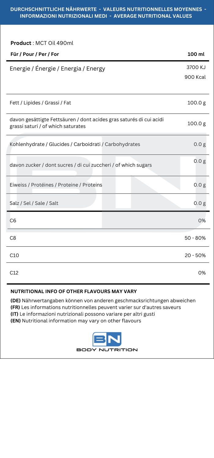 di cui acidi grassi saturi (MCT) 100.00 g 14.00 g