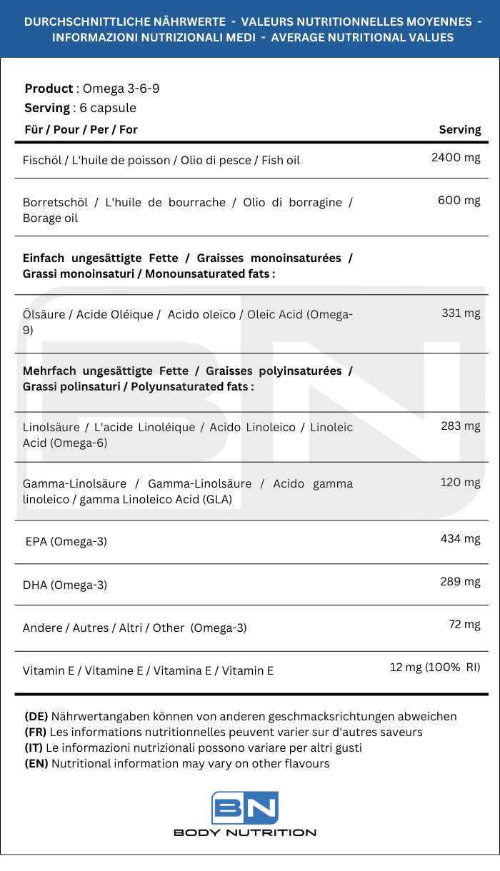 Fischöl ( Lachs ) (davon EPA 18 % und DHA 12 %), Kapsel (Speisegelatine), Borretschöl (Borago officinalis L.; davon GLA 20 %, Ölsäure 15 %), Festigungsmittel: Glycerin; D-Alpha-Tocopherol (Vitamin E).