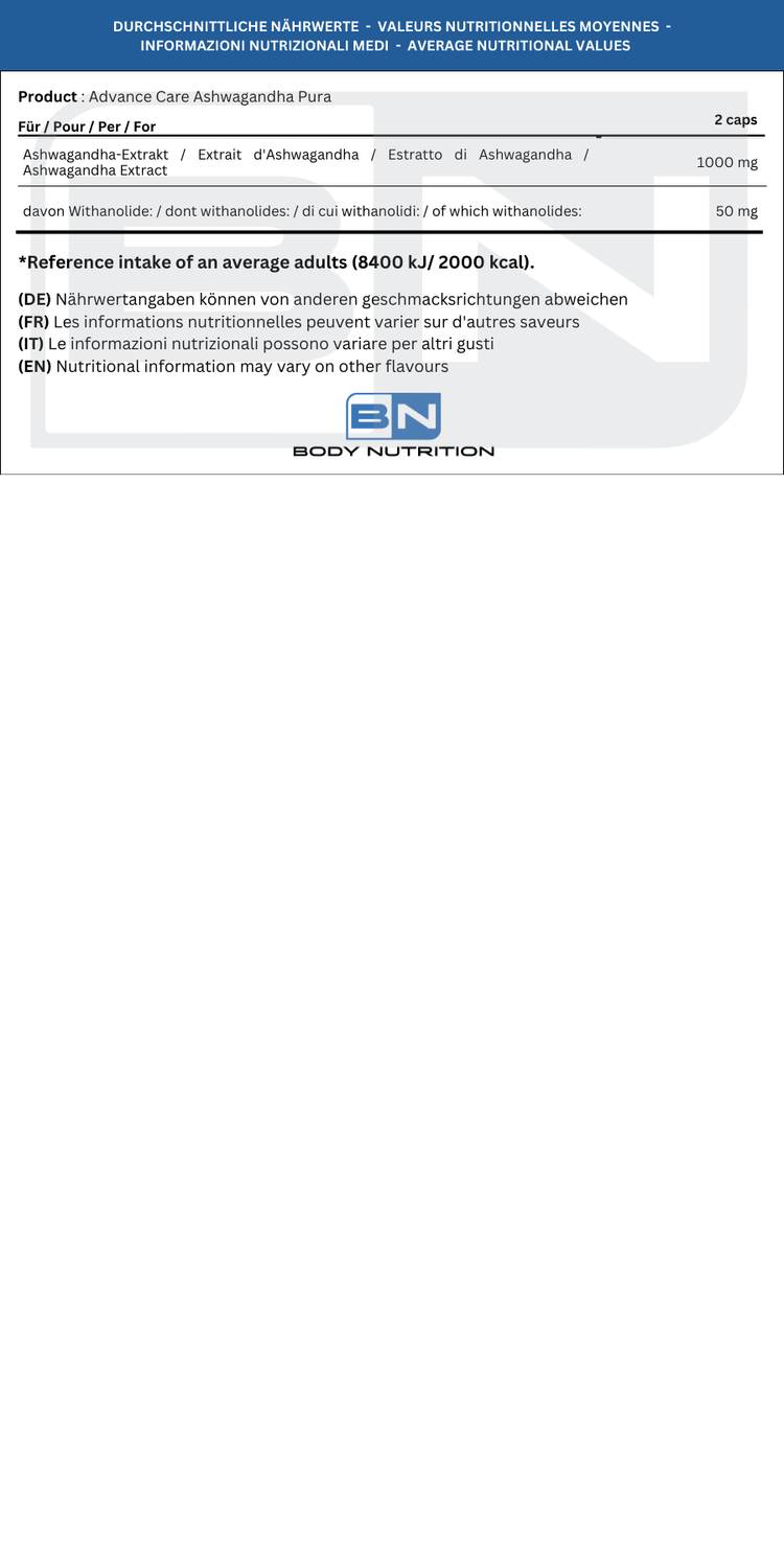 Note:contient un texte de racine deWithania somnifera(Ashwagandha) KSM-66®, standardisé à 5 % dans des anolidés, obtenu avec un processus breveté qui préserve les constituants naturels de la plante.