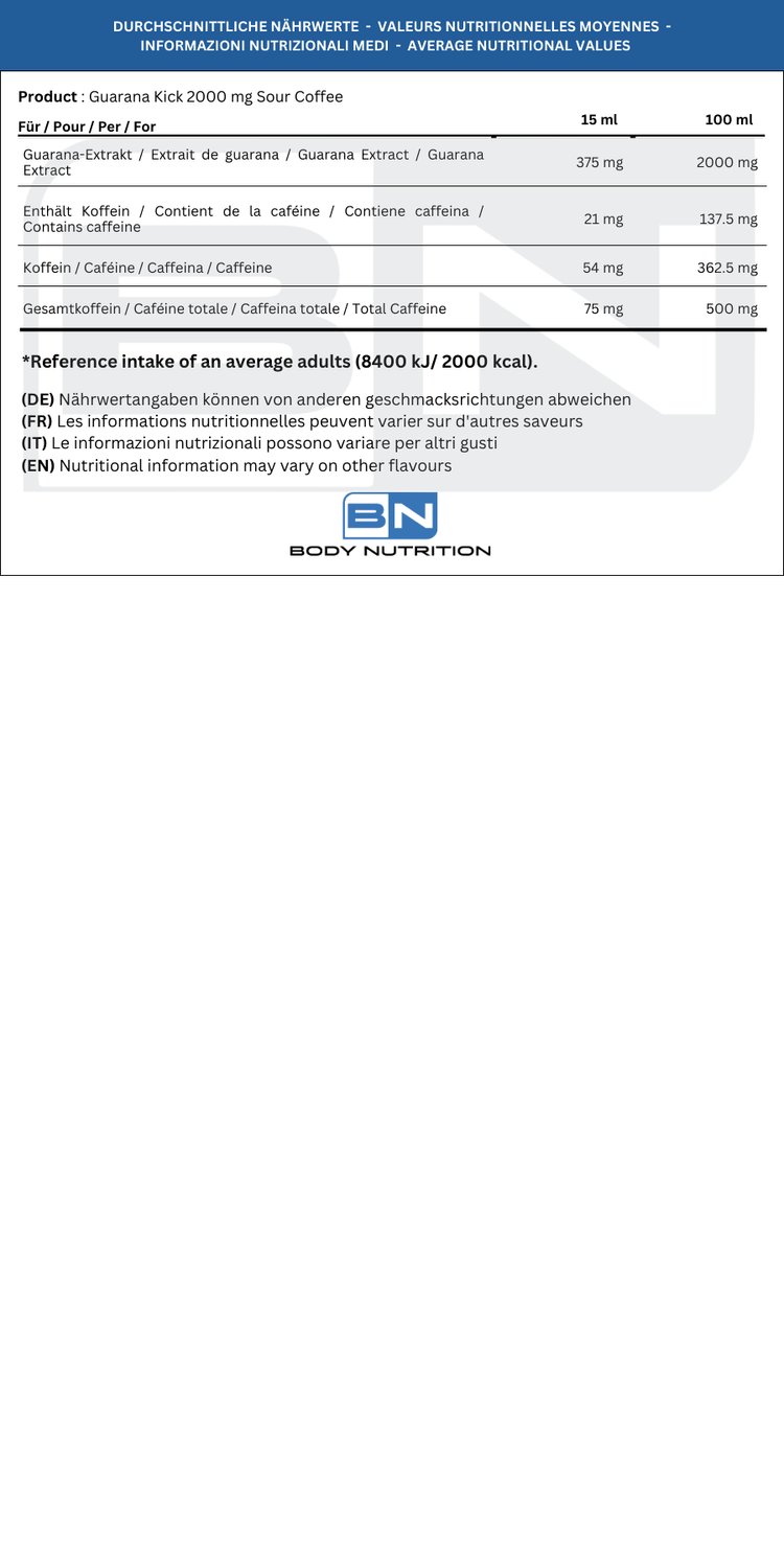 Guarana Kick 2000 Shot aide à éliminer la stabilité et à améliorer la concentration mentale. Ottimo come pré-allenamento, pendante sessioni di studio or work impegnative, o wheno serve un boost sans ricorrere al caffè.