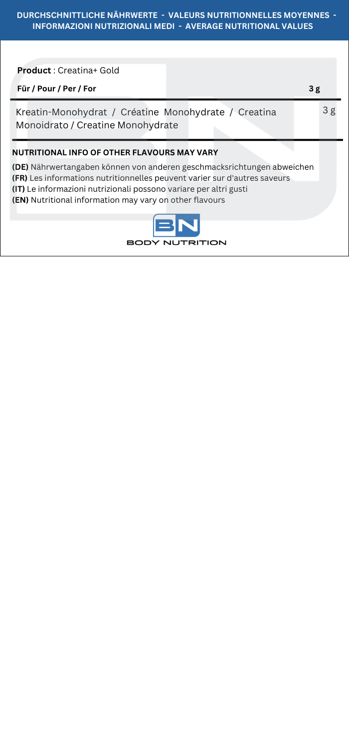Caratteristiche nutrizionali:Sans gluten, sans gluten, créatine ultra pura