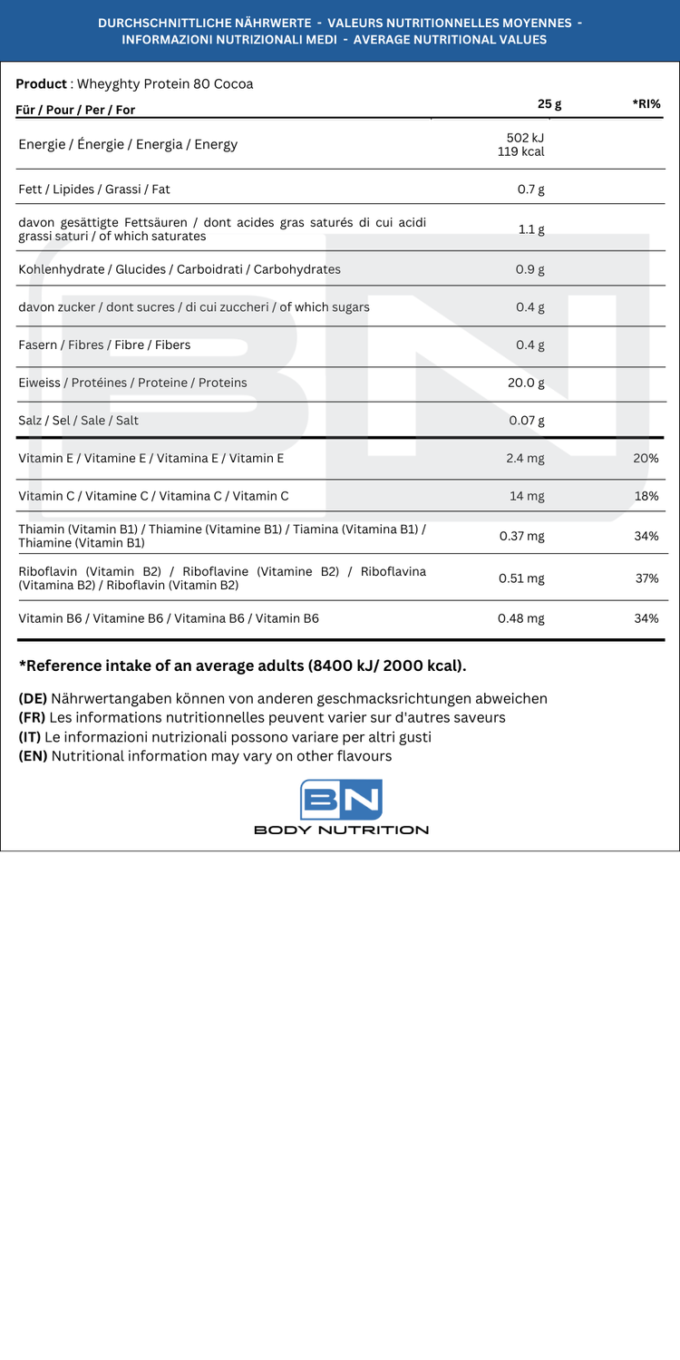 Disponible dans les formats de 250 g, 750 pour 2 kg, Wheyghty Protein 80 est la sélection idéale pour ce qui concerneProtéines de lactosérum fabriquées en Italieadatte ad ogni esigenza nutrizionale.