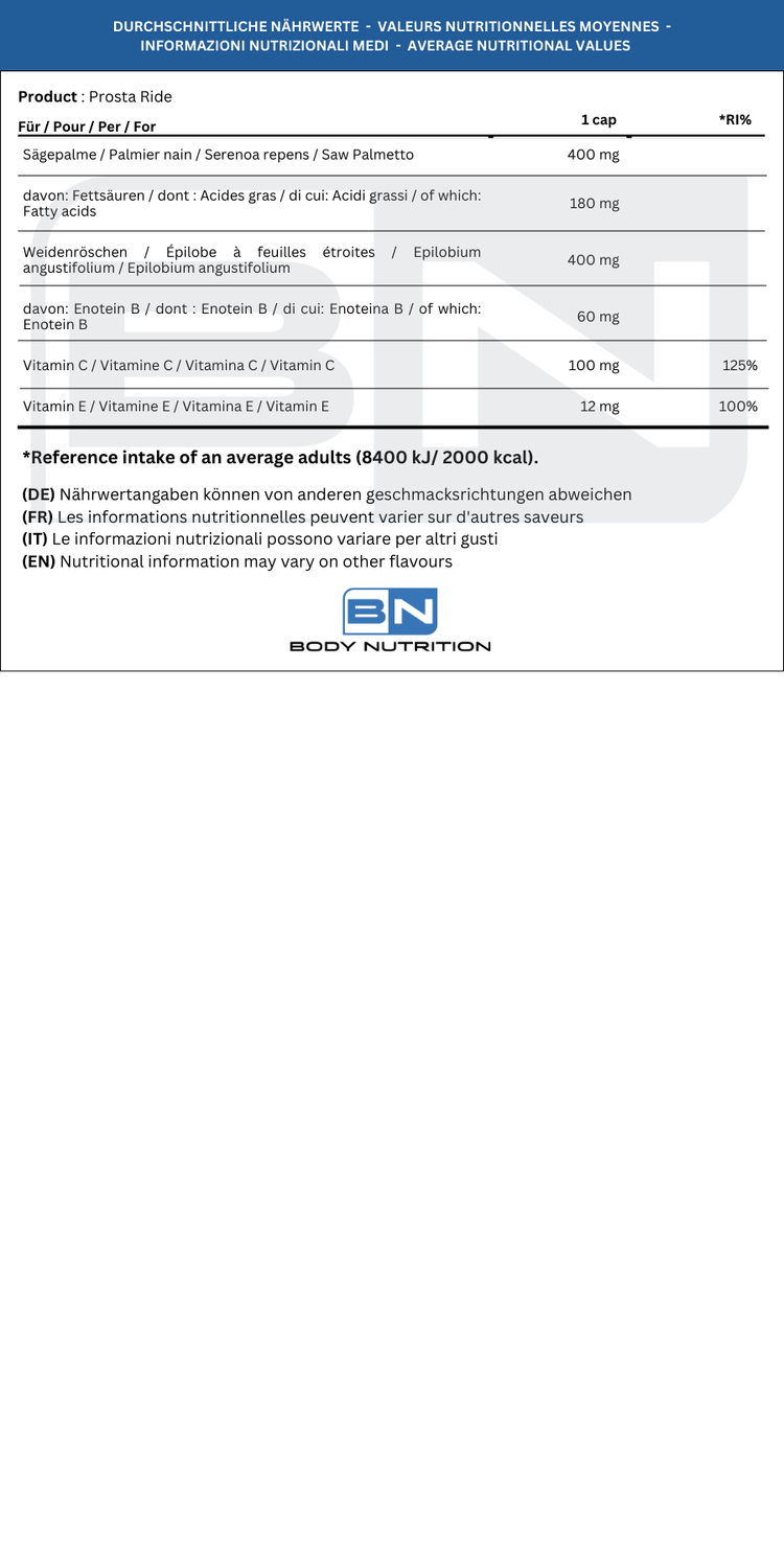 Prosta Ride +Watt è un integratore alimentare in compresse senza glutine, formulato con estratti vegetali standardizzati di Serenoa repens ed Enotprost® (Epilobium angustifolium), completato con vitamina C e vitamina E. La sua composizione è pensata per offrire un supporto nutrizionale mirato al benessere maschile.