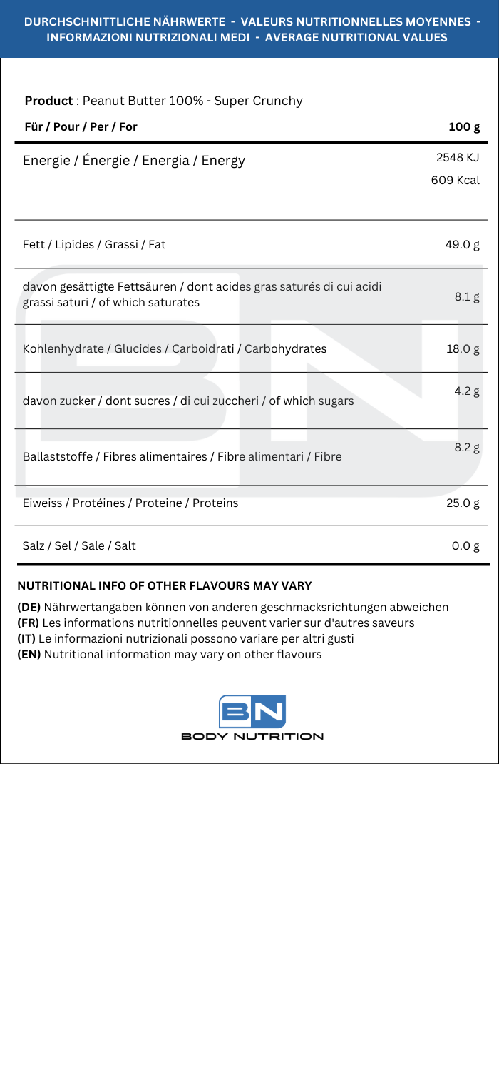 Disponibile in diversi formati, il Peanut Butter 100% Super Crunchy è la scelta ideale per chi vuole unire gusto ed energia con un prodotto 100% naturale, vegan e senza glutine.