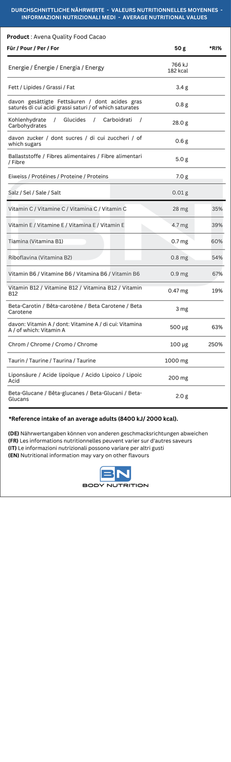 Avena Quality Food è una farina d’avena istantanea gluten free, arricchita con vitamine, minerali e micronutrienti funzionali. La sua formula bilanciata è pensata per offrire un’alternativa nutriente e versatile alla farina tradizionale, ideale sia per sportivi che per chi desidera mantenere un’alimentazione sana e bilanciata.