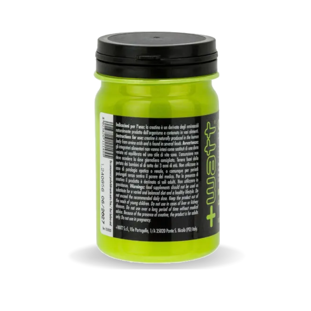 L’integratore è formulato e confezionato in Italia da +Watt, garanzia di qualità e standard produttivi certificati. La creatina svolge un ruolo fondamentale nel metabolismo energetico, contribuendo alla rigenerazione dell’ATP e sostenendo gli sforzi intensi e ripetuti. Grazie alla certificazione Creapure®, ogni dose garantisce qualità superiore e assenza di impurità.