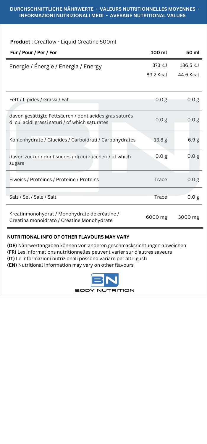 Acqua Filtrata a 5 Fasi, Sistema CreaFlow™ [Glicerolo, Creatina Monoidrato Ultra Micronizzata, Regolatori di Acidità (Acido Citrico, Acido Fosforico)], Edulcorante (Sucralosio), Aromi, Conservanti (Sorbato di Potassio, Benzoato di Sodio).