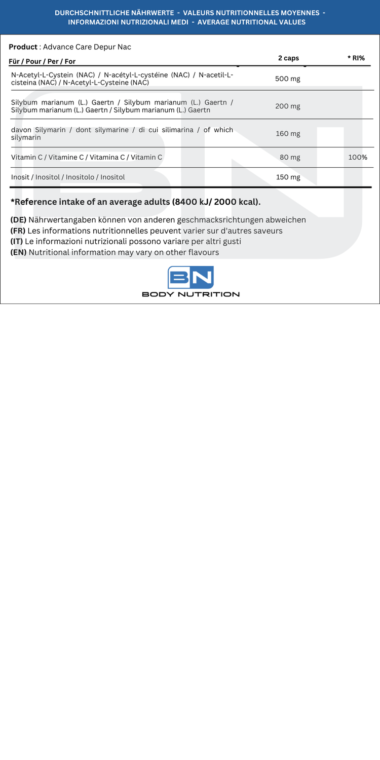 • Contiene N-acetil-L-cisteina (NAC), cardo mariano, inositolo e vitamina C