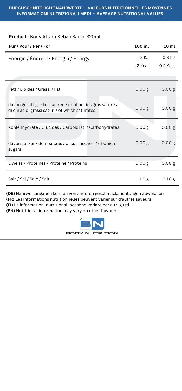 Salsa Low Calorie Kebab – Body Attack (320ml): salsa dal gusto speziato e deciso, ispirata al classico kebab ma con solo 0,2 kcal per porzione (10 ml). Perfetta per accompagnare carne, verdure grigliate o piatti fit senza zuccheri né grassi. Formula low-carb e vegana