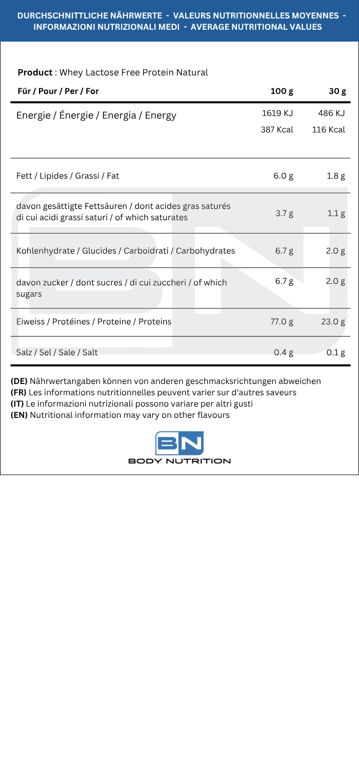 Proteine concentrate del siero del latte senza lattosio, con elevata digeribilità e ottima solubilità. Ideali per chi soffre di intolleranza al lattosio o cerca una fonte proteica leggera e completa, con gusto naturale e arricchite da un profilo aminoacidico bilanciato.