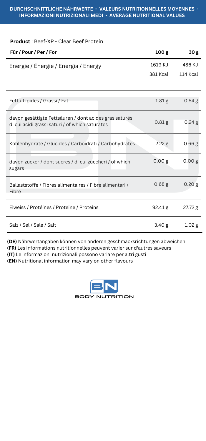 Le Beef-XP di Applied Nutrition sono proteine isolate di manzo al 97%, con oltre 27 g di proteine per porzione e ZERO LATTOSIO e ZERO ZUCCHERI, completamente prive di derivati del latte. Una scelta innovativa per chi cerca un’alternativa alle whey tradizionali: pura, digeribile e con gusti fruttati e freschi che nulla hanno a che vedere con il sapore della carne.