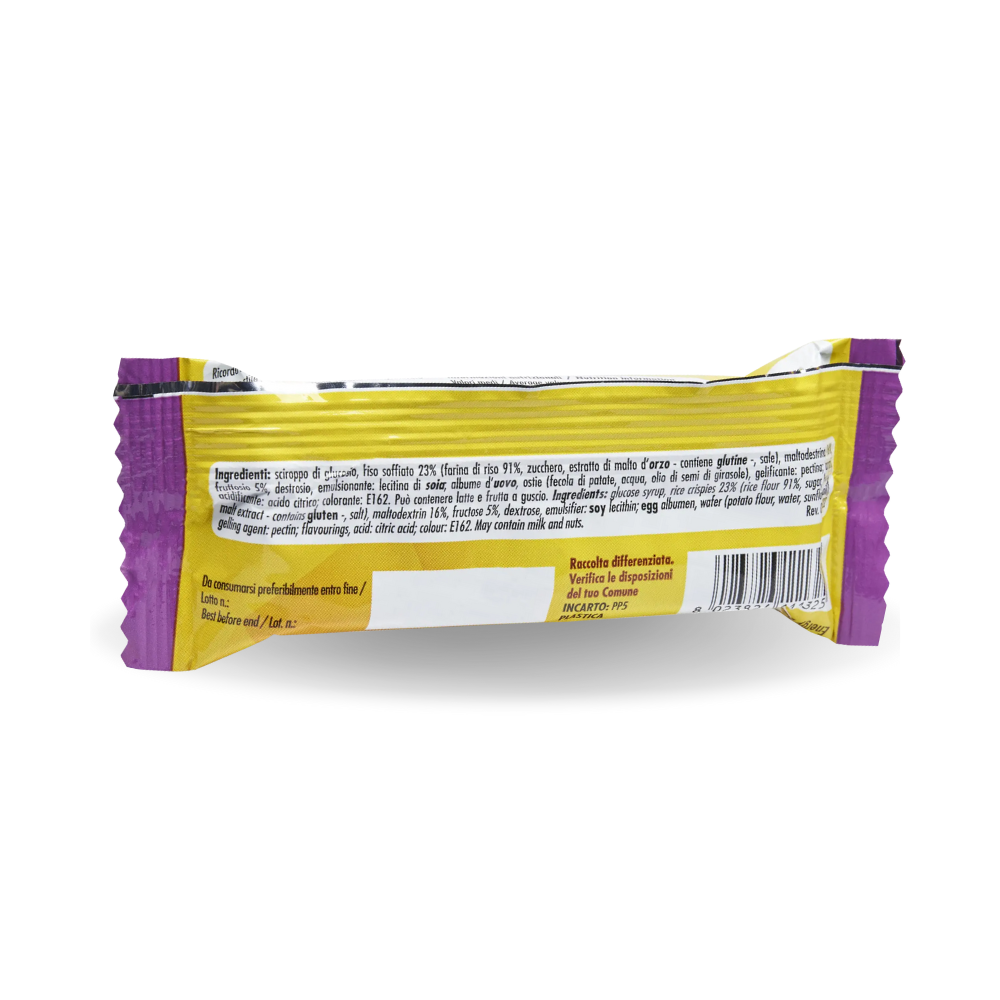 Sciroppo di glucosio, riso soffiato 23% (farina di riso 91%, zucchero, estratto di malto d’orzo – contiene glutine –, sale), maltodestrina 16%, fruttosio 5%, destrosio, emulsionante: lecitina di soia; albume d’uovo, ostie (fecola di patate, acqua, olio di semi di girasole), gelificante: pectina; aromi, acidificante: acido citrico; colorante: E162.
