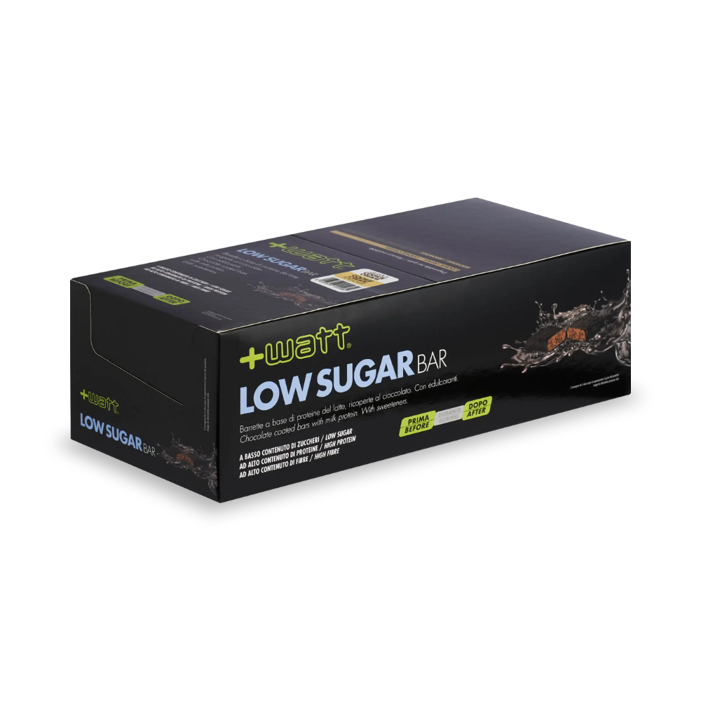 +WATT Low Sugar Bar è una barretta proteica da 50 g con il 30% di proteine del latte, arricchita da una copertura al cioccolato e dolcificata con edulcoranti a basso indice glicemico. Unisce gusto e funzionalità, ideale per chi desidera uno snack proteico con un ridotto contenuto di zuccheri.