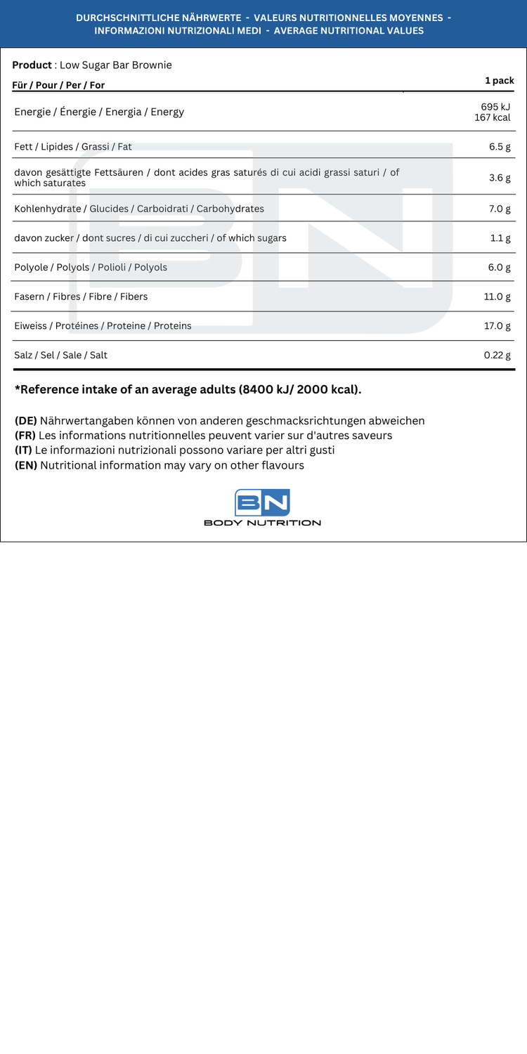 La Low Sugar Bar è senza glutine ed è disponibile in due gusti deliziosi — Brownie e Cookie Cream — per unire nutrizione e piacere in un pratico formato tascabile.
