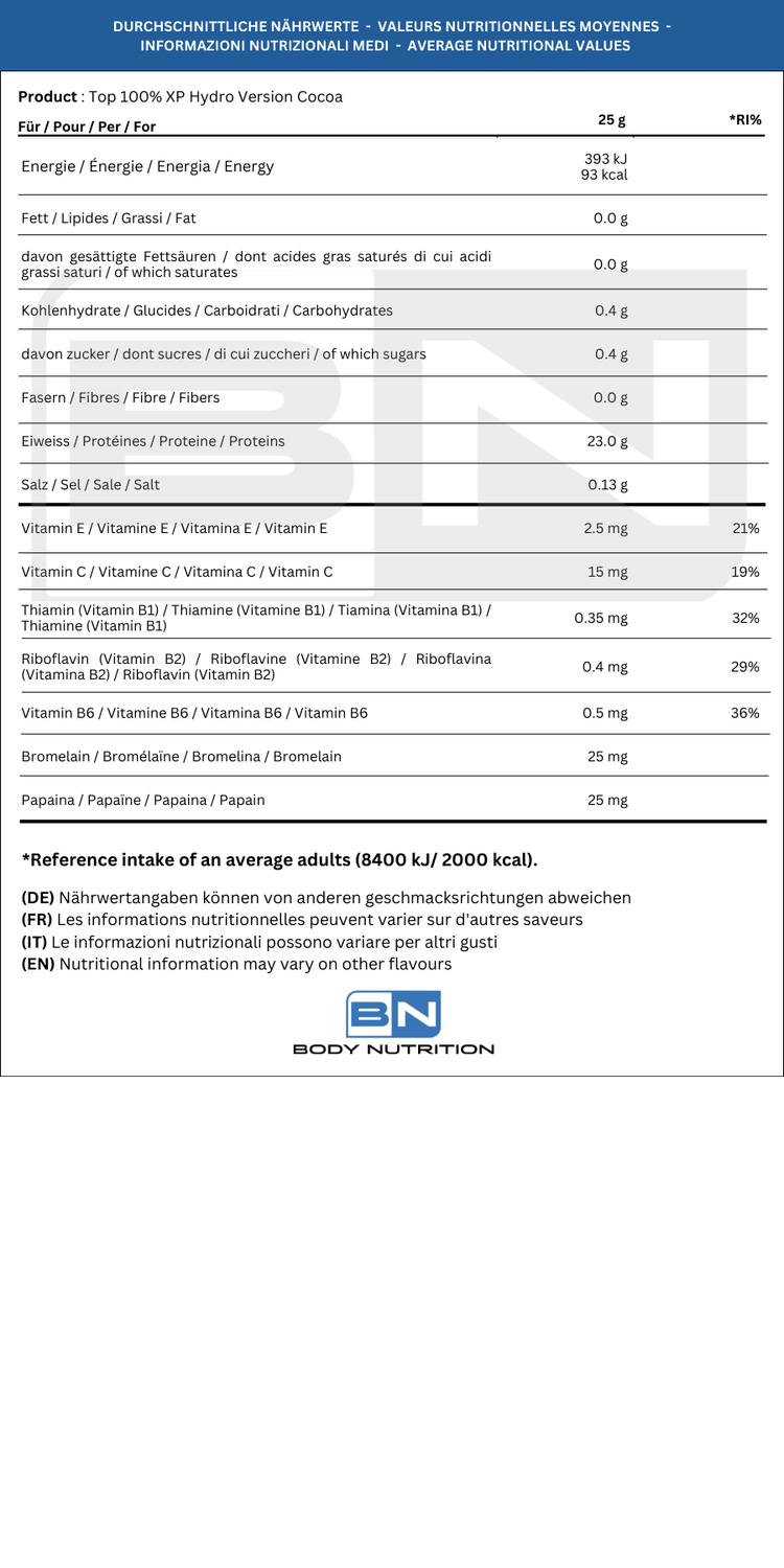 Con un contenuto estremamente basso di grassi e carboidrati e meno di 0,1 g di lattosio per dose, TOP 100% XP Hydro Version è ideale anche per chi presenta una leggera intolleranza al lattosio. Inoltre, il prodotto è senza glutine e addolcito con sucralosio, per un gusto gradevole senza zuccheri aggiunti.