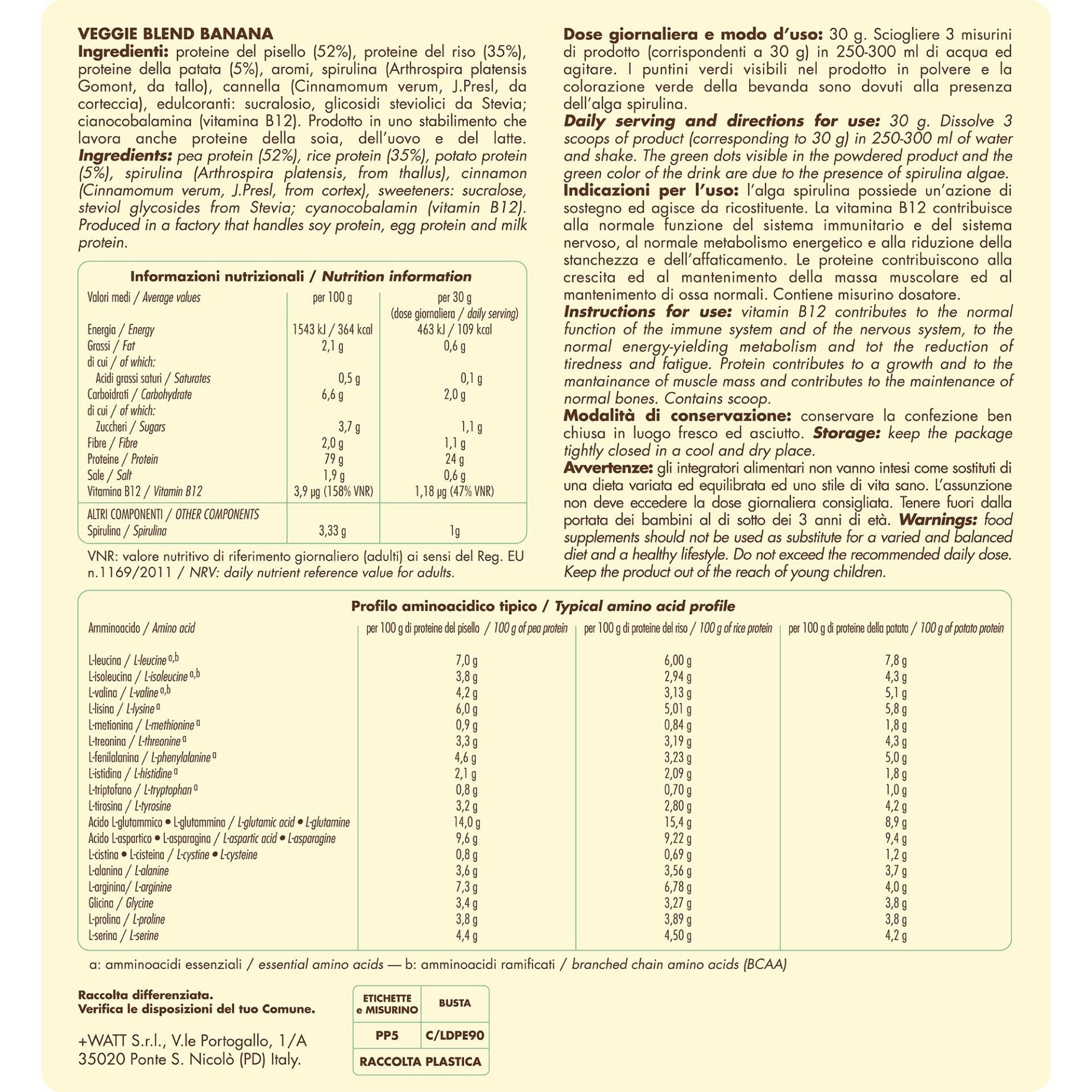 Veggie Blend di +Watt è una polvere proteica 100% vegetale, perfetta per chi segue uno stile di vita attivo o una dieta plant-based. Combina proteine del pisello, riso e patata per offrire un profilo amminoacidico completo, arricchito con spirulina, cannella e vitamina B12. Naturalmente vegano e senza glutine, facile da usare nei tuoi frullati o ricette proteiche.